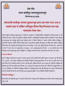 खबर की तहतक ✍️ थाना कादीपुर, जनपद सुलतानपुर दिनांक – 04.03.2026 उत्तर प्रदेश पुलिस के तहत जनपद सुलतानपुर की कोतवाली कादीपुर पुलिस ने दुष्कर्म एवं पाक्सो एक्ट से संबंधित प्रकरण में वांछित चल रहे एक अभियुक्त को गिरफ्तार कर माननीय न्यायालय के समक्ष भेज दिया है। श्रीमान पुलिस अधीक्षक सुलतानपुर के आदेशानुसार वांछित/संदिग्ध अभियुक्तों की गिरफ्तारी हेतु चलाए जा रहे अभियान के क्रम में, अपर पुलिस अधीक्षक महोदय एवं क्षेत्राधिकारी कादीपुर के निर्देशन में दिनांक 04.03.2026 को थाना कादीपुर पुलिस टीम द्वारा क्षेत्र भ्रमण, लंबित विवेचनाओं की समीक्षा एवं संदिग्ध व्यक्तियों/वाहनों की चेकिंग की जा रही थी। इसी दौरान मुखबिर की सूचना पर गोपालपुर मोड़ पर दबिश देकर वांछित अभियुक्त दीपक सिंह उर्फ दीपू सिंह को समय लगभग 11:55 बजे पुलिस हिरासत में लिया गया। उक्त प्रकरण थाना कादीपुर पर पंजीकृत मु0अ0सं0 017/2023 धारा 363/366/376 बीएनएस व 3/4 पाक्सो एक्ट से संबंधित है। घटना का विवरण वादिनी द्वारा दी गई तहरीर के आधार पर दिनांक 11.01.2023 को अभियुक्त द्वारा वादिनी की नाबालिग पुत्री को बहला-फुसलाकर भगा ले जाने तथा उसके साथ दुष्कर्म किए जाने का आरोप लगाया गया था। प्राप्त तहरीर के आधार पर थाना कादीपुर में दिनांक 14.01.2023 को अभियोग पंजीकृत कर विवेचना प्रारंभ की गई थी। पुलिस द्वारा तत्परता से कार्यवाही करते हुए दिनांक 21.01.2023 को अपहृता को सकुशल बरामद कर परिजनों के सुपुर्द किया गया था। प्रकरण में नामित अभियुक्त दीपक सिंह उर्फ दीपू सिंह पुत्र राम अवतार निवासी ग्राम रसालपुर मौजा किशोरपुर थाना बरौर जनपद कानपुर देहात (उम्र 23 वर्ष) की गिरफ्तारी शेष थी, जिसे आज दिनांक 04.03.2026 को गिरफ्तार कर लिया गया है। अभियुक्त को विधिक कार्यवाही पूर्ण कर माननीय न्यायालय के समक्ष प्रस्तुत किया जा रहा है। अन्य आवश्यक विधिक कार्यवाही प्रचलित है। गिरफ्तार अभियुक्त दीपक सिंह उर्फ दीपू सिंह पुत्र राम अवतार निवासी ग्राम रसालपुर मौजा किशोरपुर थाना बरौर, जनपद कानपुर देहात उम्र – 23 वर्ष पुलिस टीम 1. प्रभारी निरीक्षक श्री श्याम सुन्दर 2. वरिष्ठ उपनिरीक्षक सुनील कुमार 3. हेड कांस्टेबल वीरेन्द्र तिवारी जनपद सुलतानपुर पुलिस द्वारा अपराध एवं अपराधियों के विरुद्ध सख्त कार्रवाई निरंतर जारी है। Post Views: 148 Post navigation होली के दृष्टिगत जलालपुर में पुलिस ने बढ़ाई सुरक्षा – #ASP(E) ने पुलिस बल के साथ भ्रमण कर शांति व्यवस्था का लिया जायज़ा तेज रफ्तार का कहर: फॉर्च्यूनर की टक्कर से MBBS छात्र की मौत, 30 मिनट तक ओवरब्रिज की रेलिंग से लटकता रहा शव